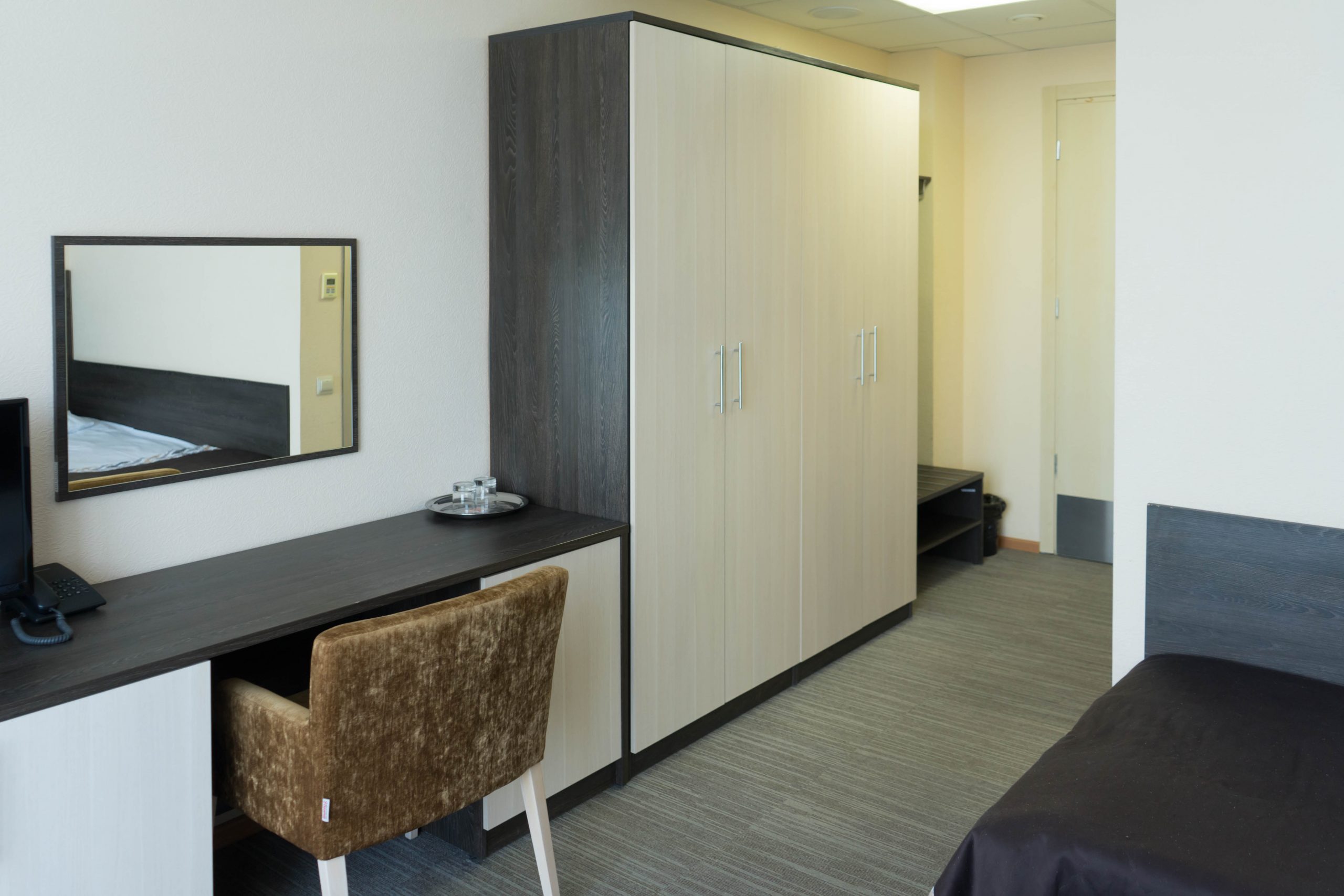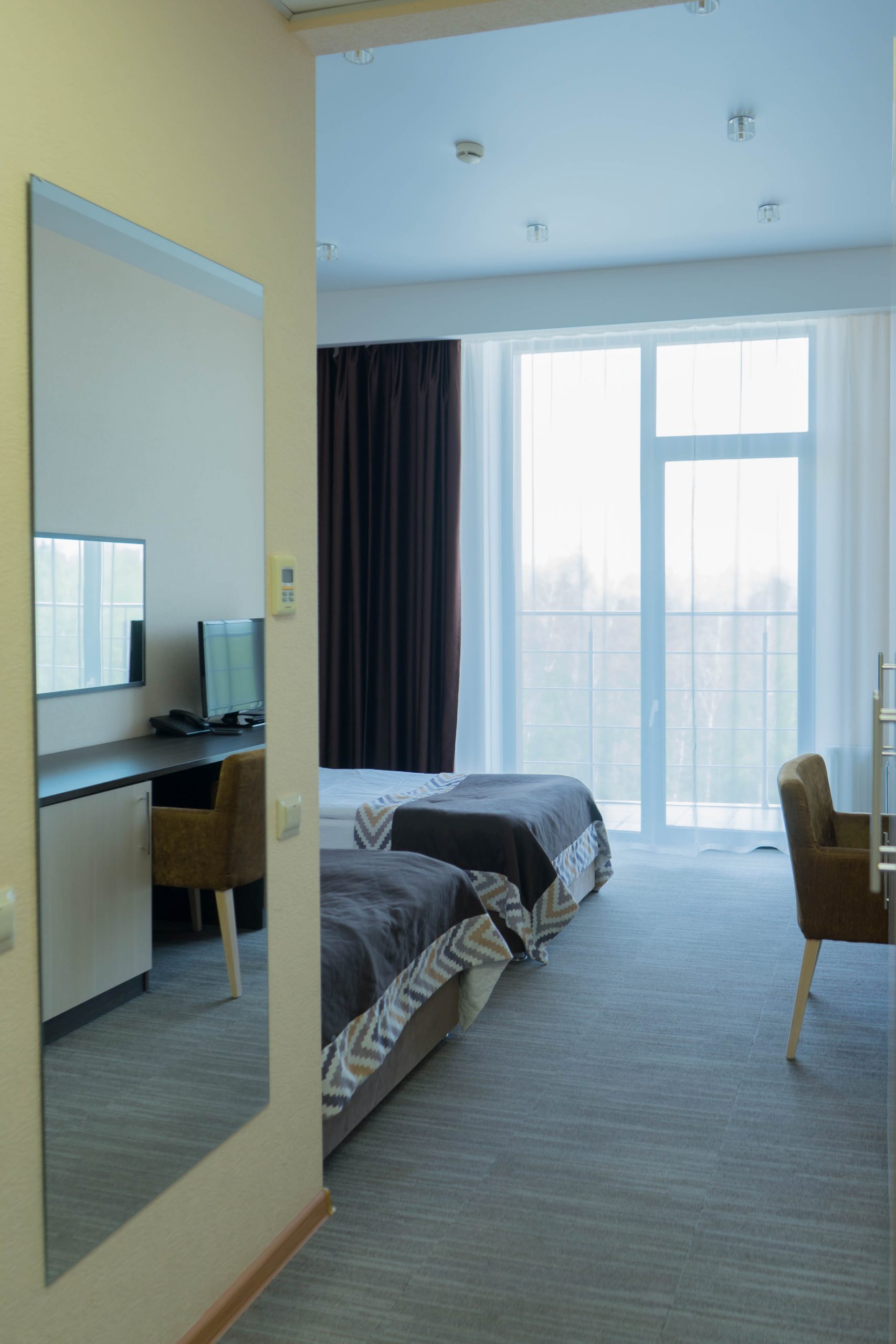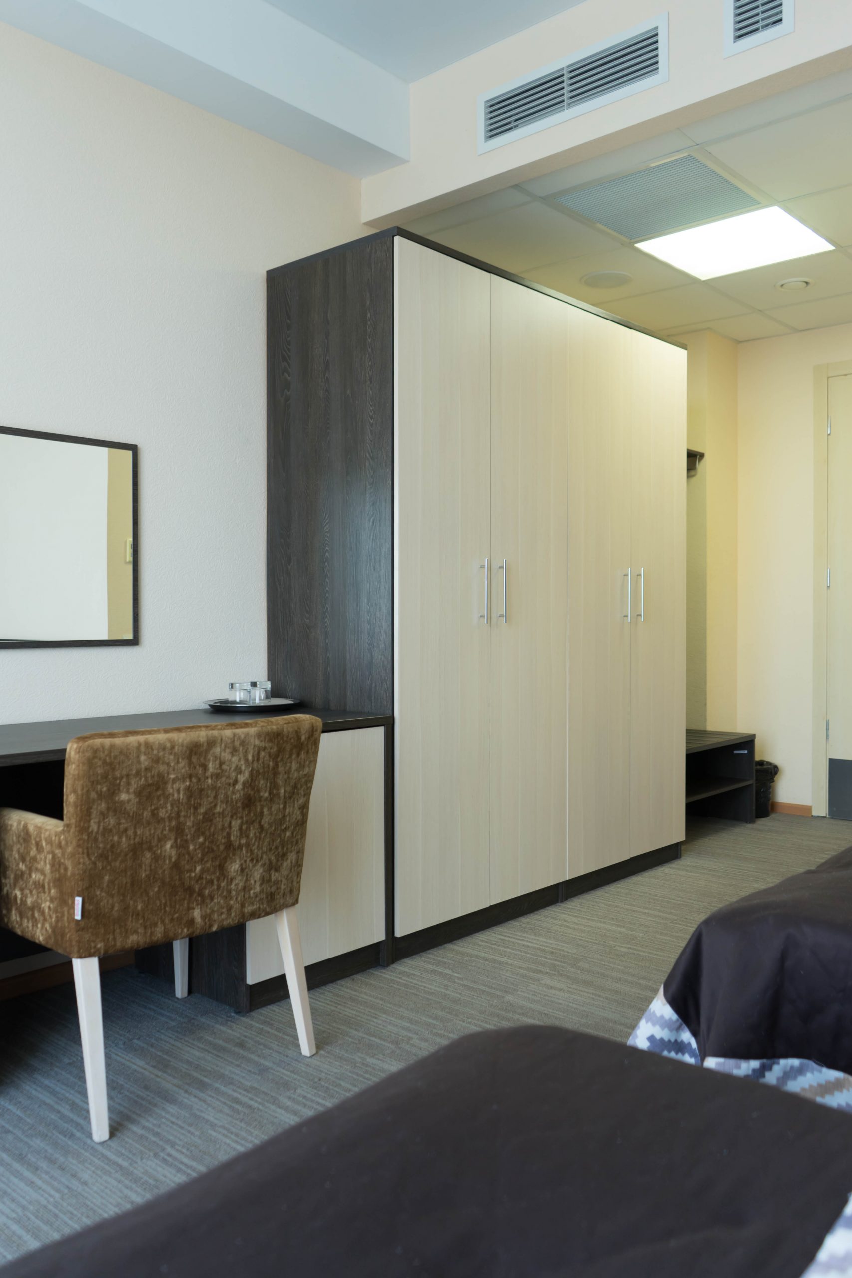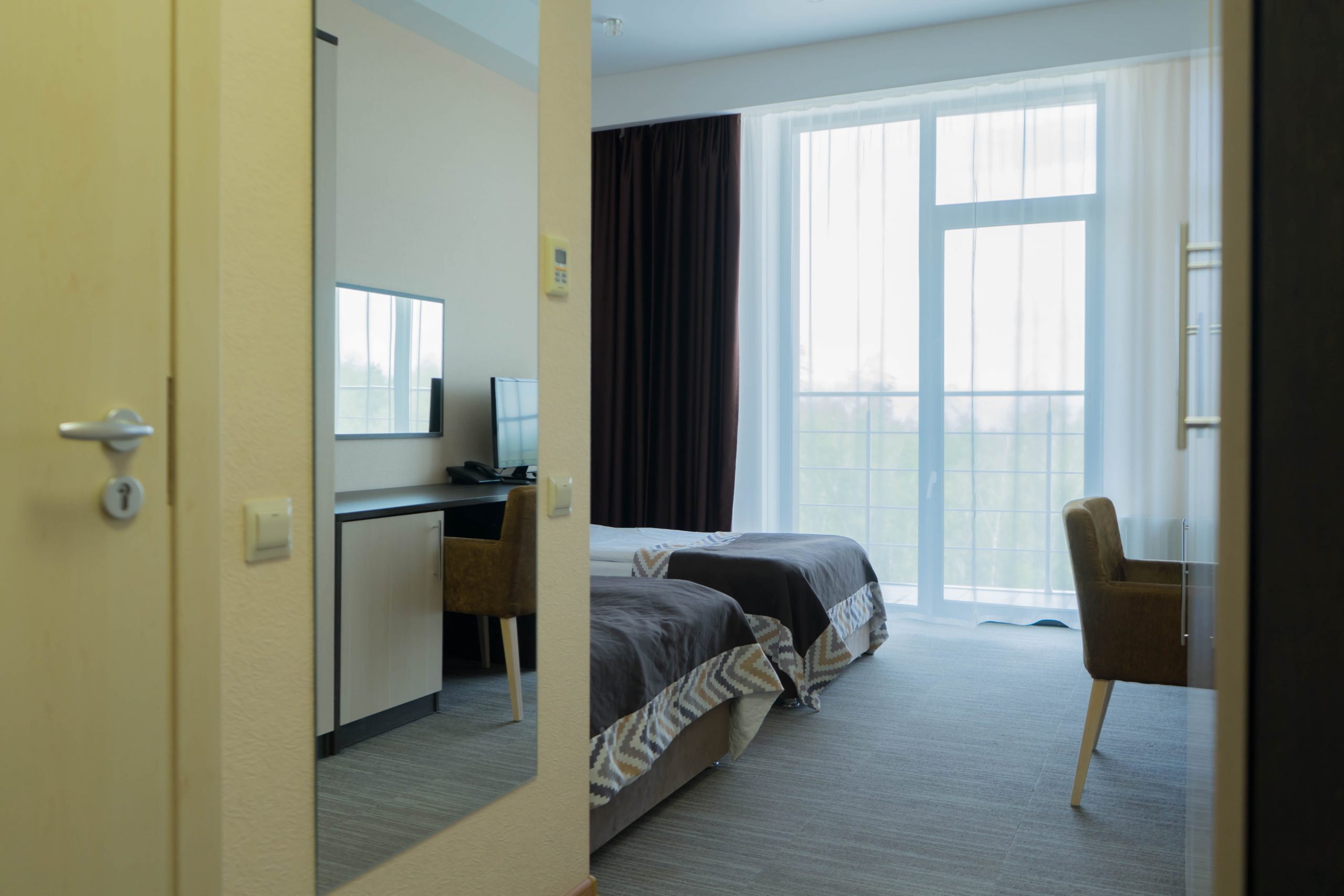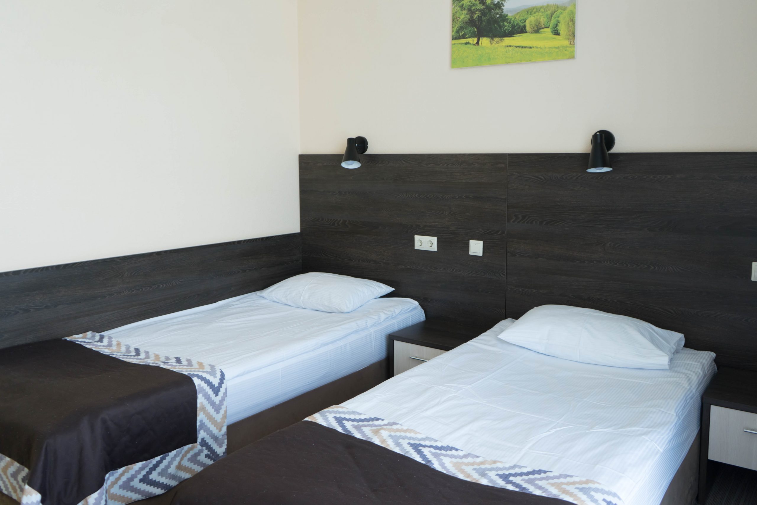 Двух местный однокомнатный номер «1 категории» оснащен двумя раздельными кроватями, двумя прикроватными тумбочками. В номере имеется стол с фригобаром ( тумба под холодильник), холодильник (мини), телевизор. Номер освещается верхним светом и настенными светильниками. Зеркало. При входе в номер настенная вешалка, для верхней одежды, платяной шкаф, тумбочка под чемодан. Сейф. В номере отдельная ванная комната, которая оборудована раковиной для мытья рук, душевой кабиной, унитаз, косметическое зеркало, электрический фен. Номер укомплектован комплектами полотенец на каждого гостя (по 3 шт на человека). На каждого гостя одноразовая гигиеническая продукция, одноразовые тапочки, швейный набор. Ключ от номера электронный, выдается каждому гостю при заселении. Ковровое покрытие. Шторы блекаут. Телефон. WI-FI