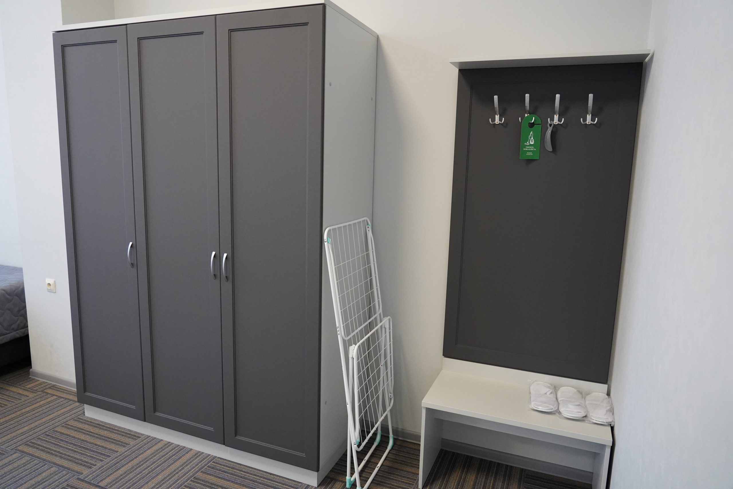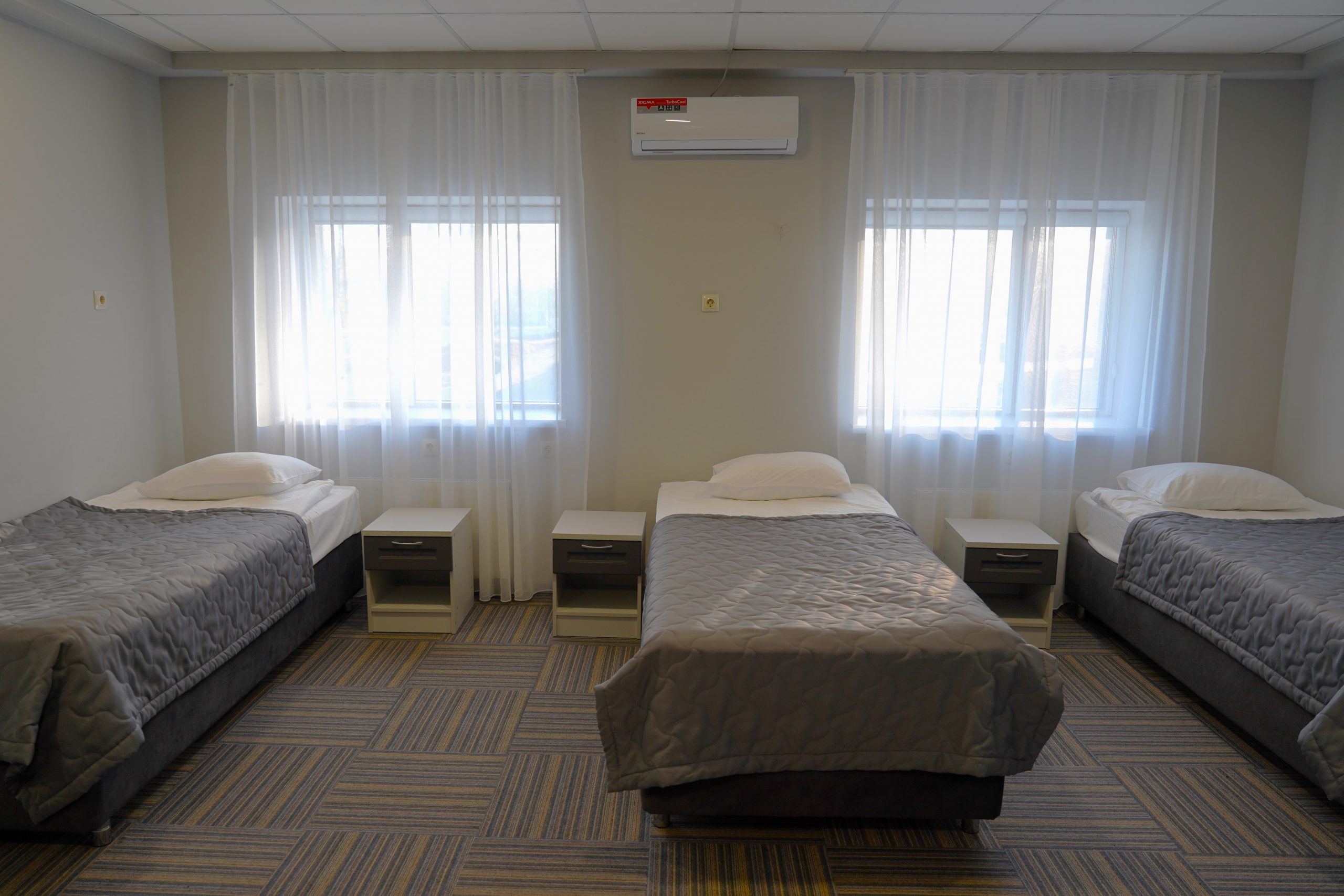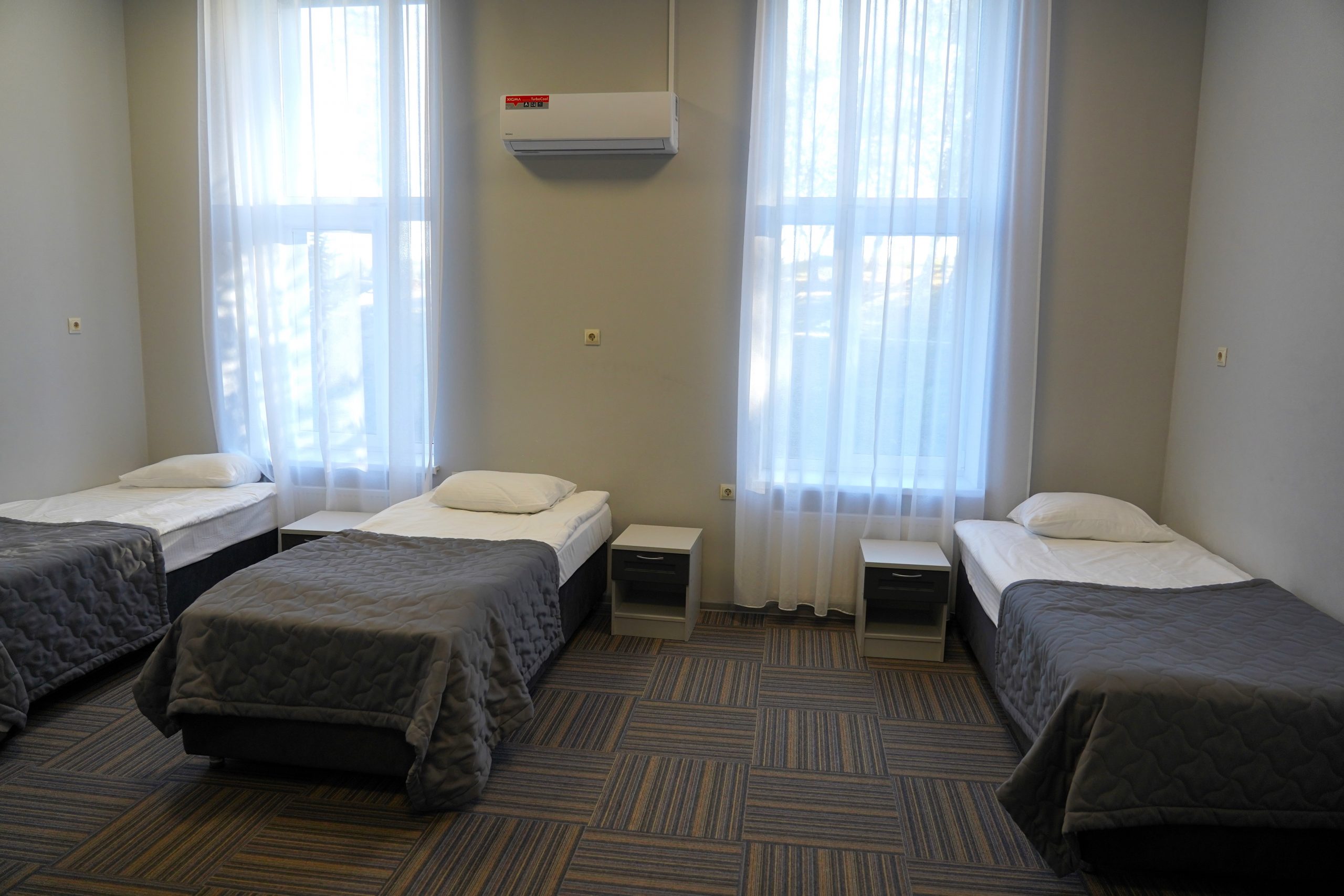 Трех местный однокомнатный номер «1 категории» оснащен тремя раздельными кроватями, тремя прикроватными тумбочками. В номере имеется стол с фригобаром (тумба под холодильник), холодильник (мини), телевизор. Номер освещается верхним светом и настенными светильниками. Зеркало. При входе в номер настенная вешалка, для верхней одежды, платяной шкаф, тумбочка под чемодан. В номере отдельная ванная комната, которая оборудована раковиной для мытья рук, душевой кабиной, унитаз, элекрический фен. Номер укомплектован комплектами полотенец на каждого гостя (по 3 шт на человека). На каждого гостя одноразовая гигиеническая продукция, одноразовые тапочки, швейный набор. Ключ от номера электронный, выдается каждому гостю при заселении. Ковровое покрытие. Шторы блекаут. WI-FI