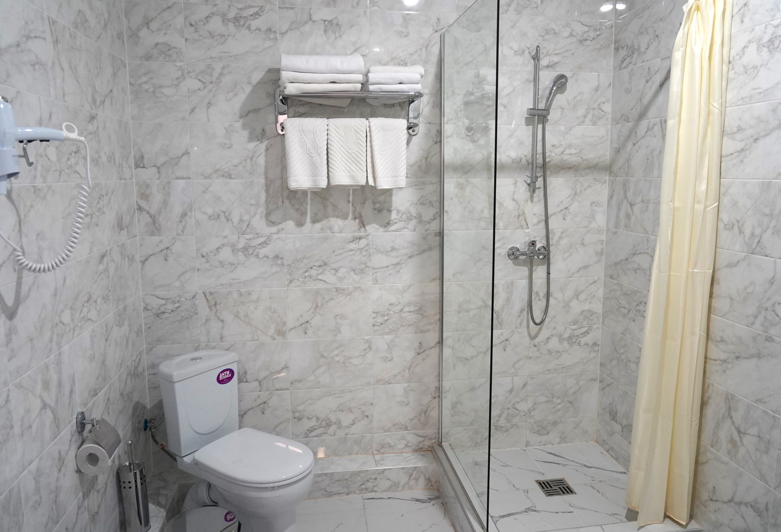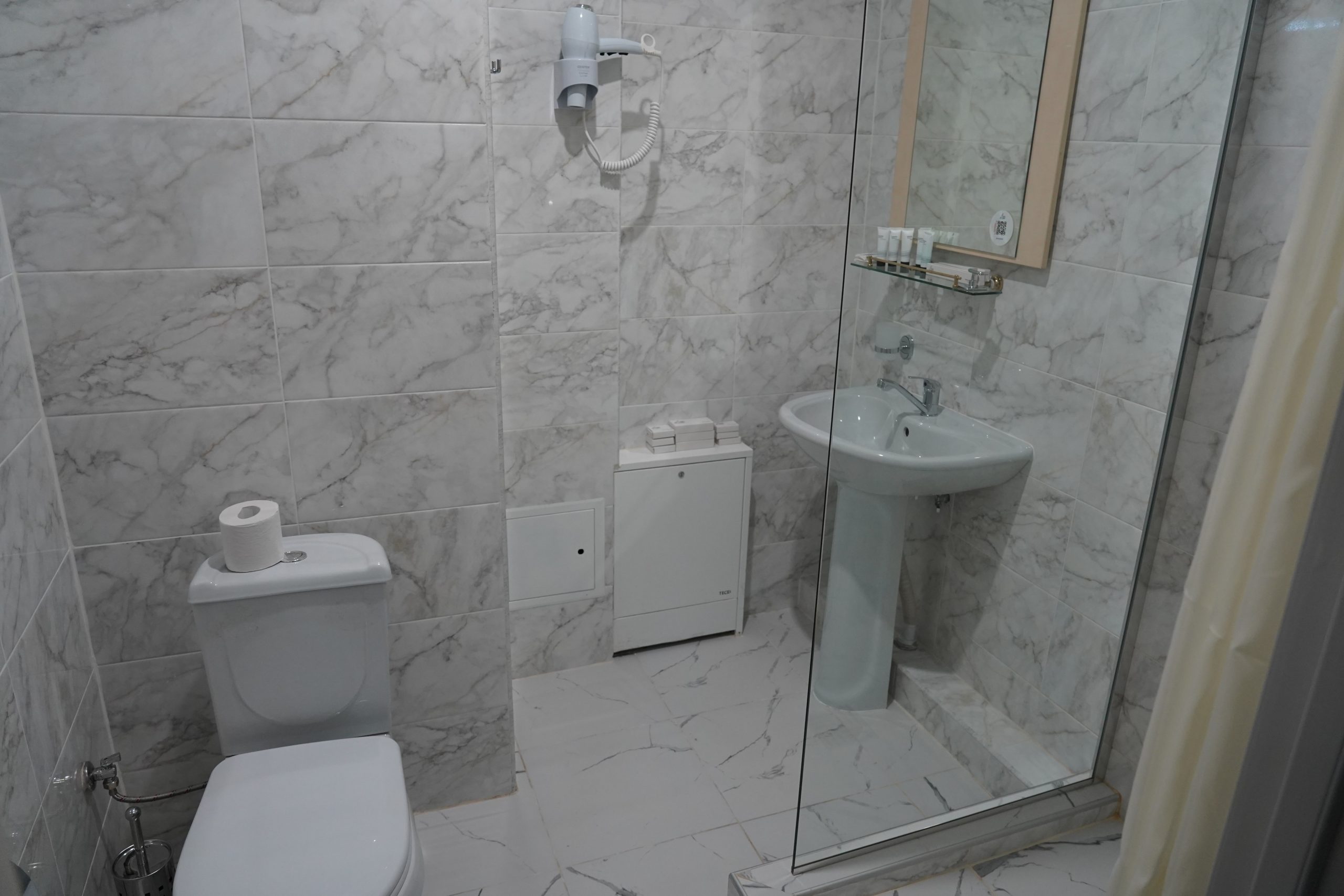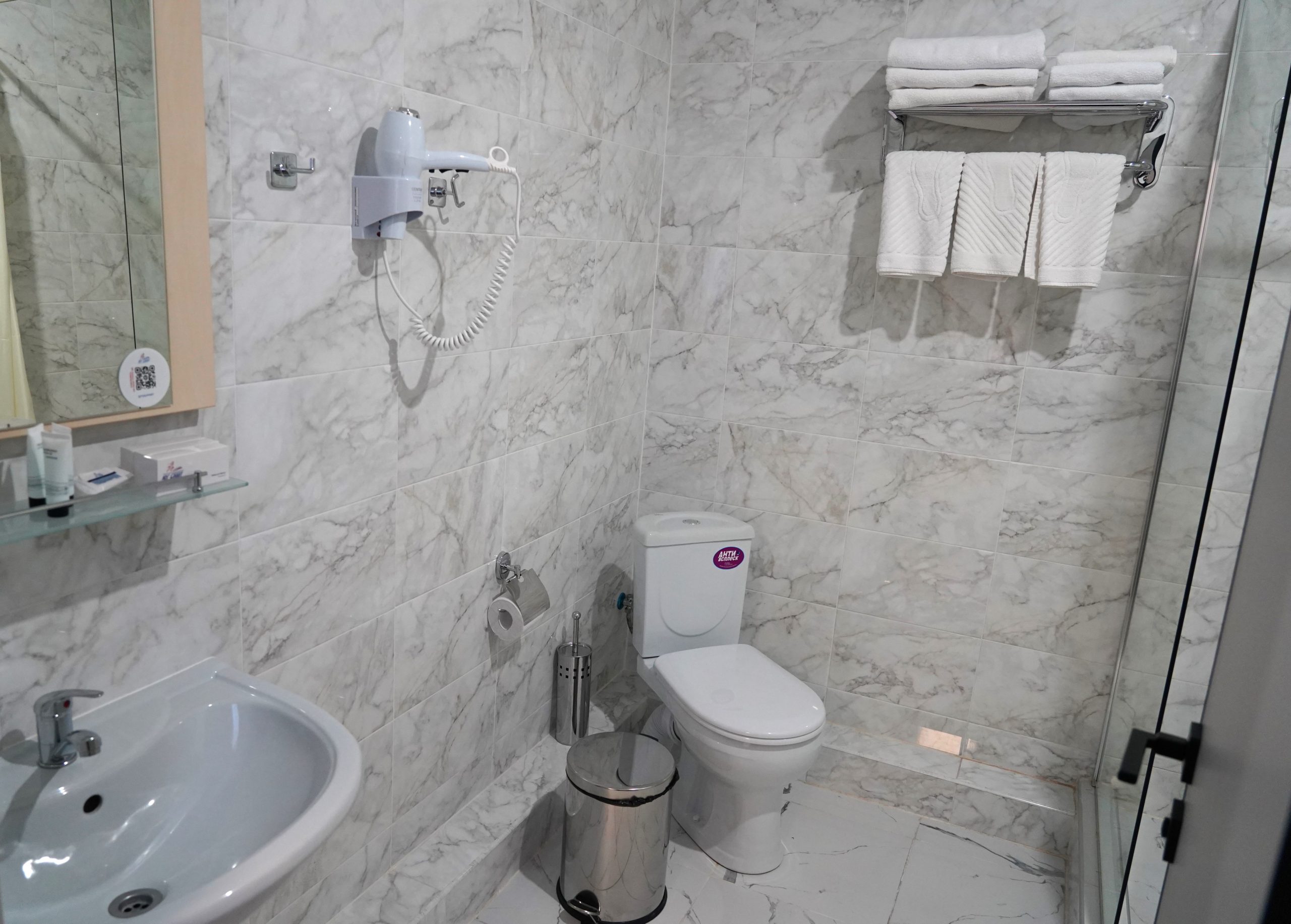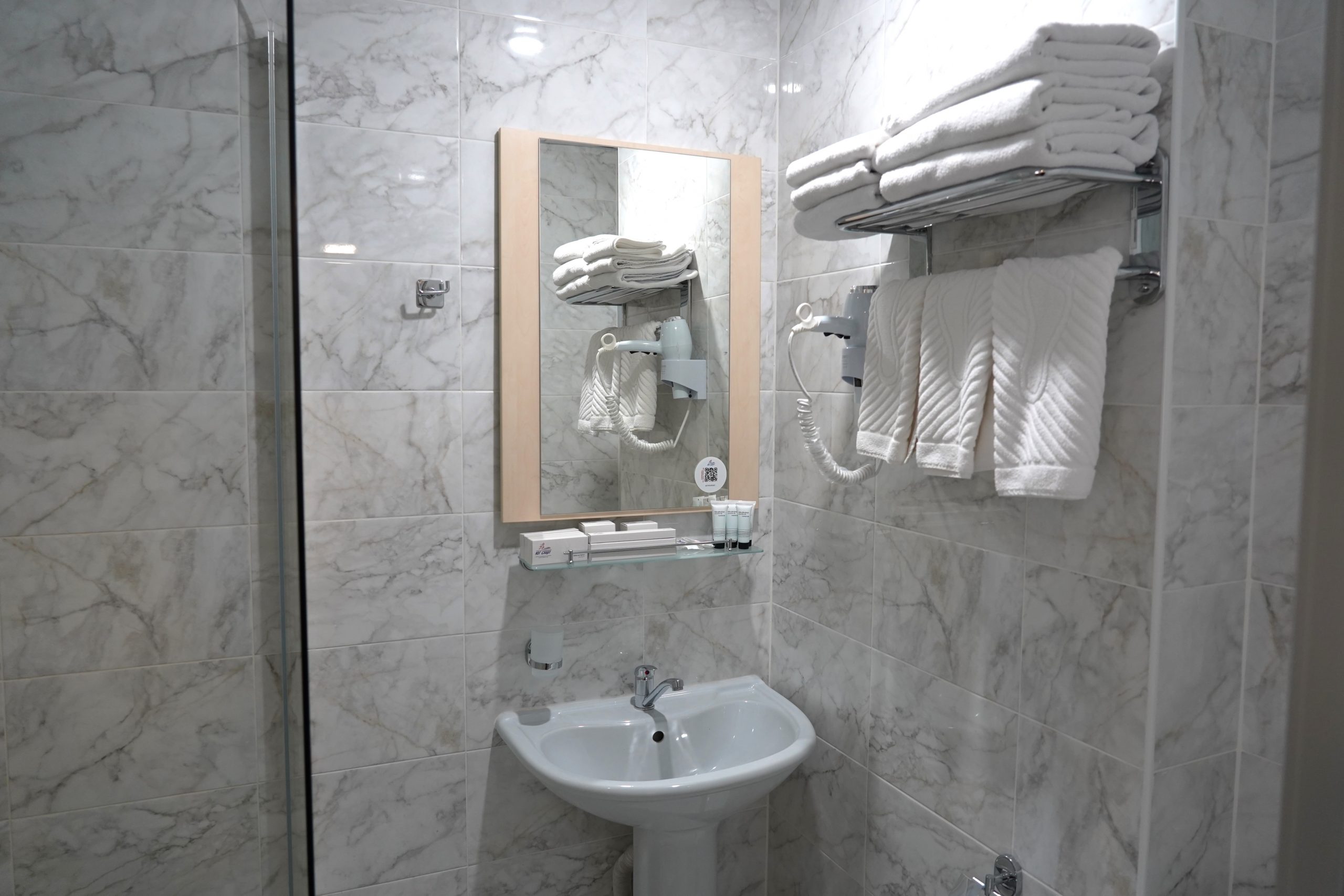 Трех местный однокомнатный номер «1 категории» оснащен тремя раздельными кроватями, тремя прикроватными тумбочками. В номере имеется стол с фригобаром (тумба под холодильник), холодильник (мини), телевизор. Номер освещается верхним светом и настенными светильниками. Зеркало. При входе в номер настенная вешалка, для верхней одежды, платяной шкаф, тумбочка под чемодан. В номере отдельная ванная комната, которая оборудована раковиной для мытья рук, душевой кабиной, унитаз, элекрический фен. Номер укомплектован комплектами полотенец на каждого гостя (по 3 шт на человека). На каждого гостя одноразовая гигиеническая продукция, одноразовые тапочки, швейный набор. Ключ от номера электронный, выдается каждому гостю при заселении. Ковровое покрытие. Шторы блекаут. WI-FI