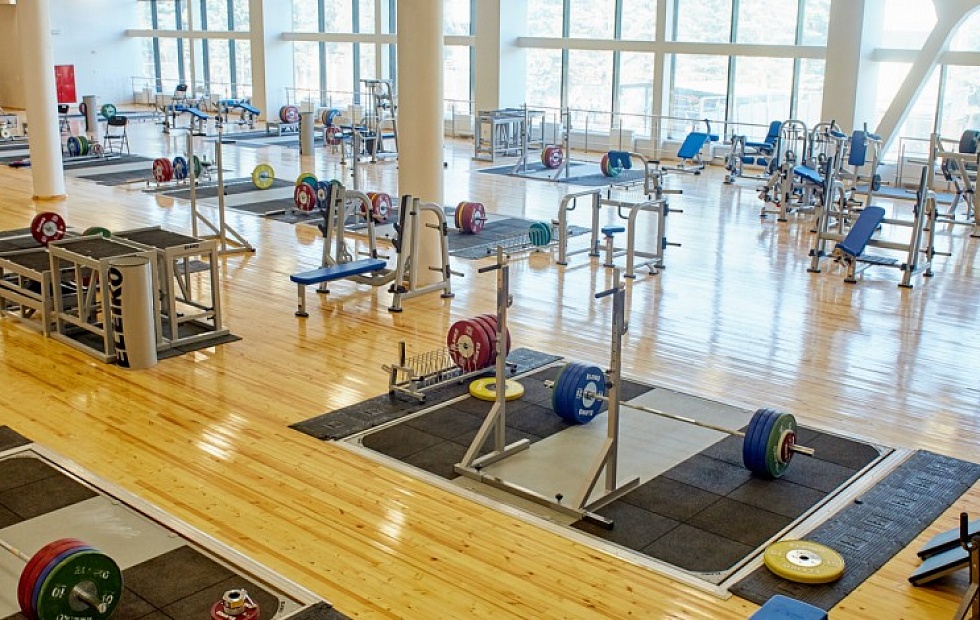 2) зал тяжелой атлетики размером 42*24 метра оснащен 20 помостами фирмы Eleiko Olympic. Для спортсменов оборудованы 2 раздевалки, массажная комната, 2 инфракрасные сауны. В зале установлен уникальный силовой тренажер VetriMax, предназначенный для проведения реактивных тренировок.
